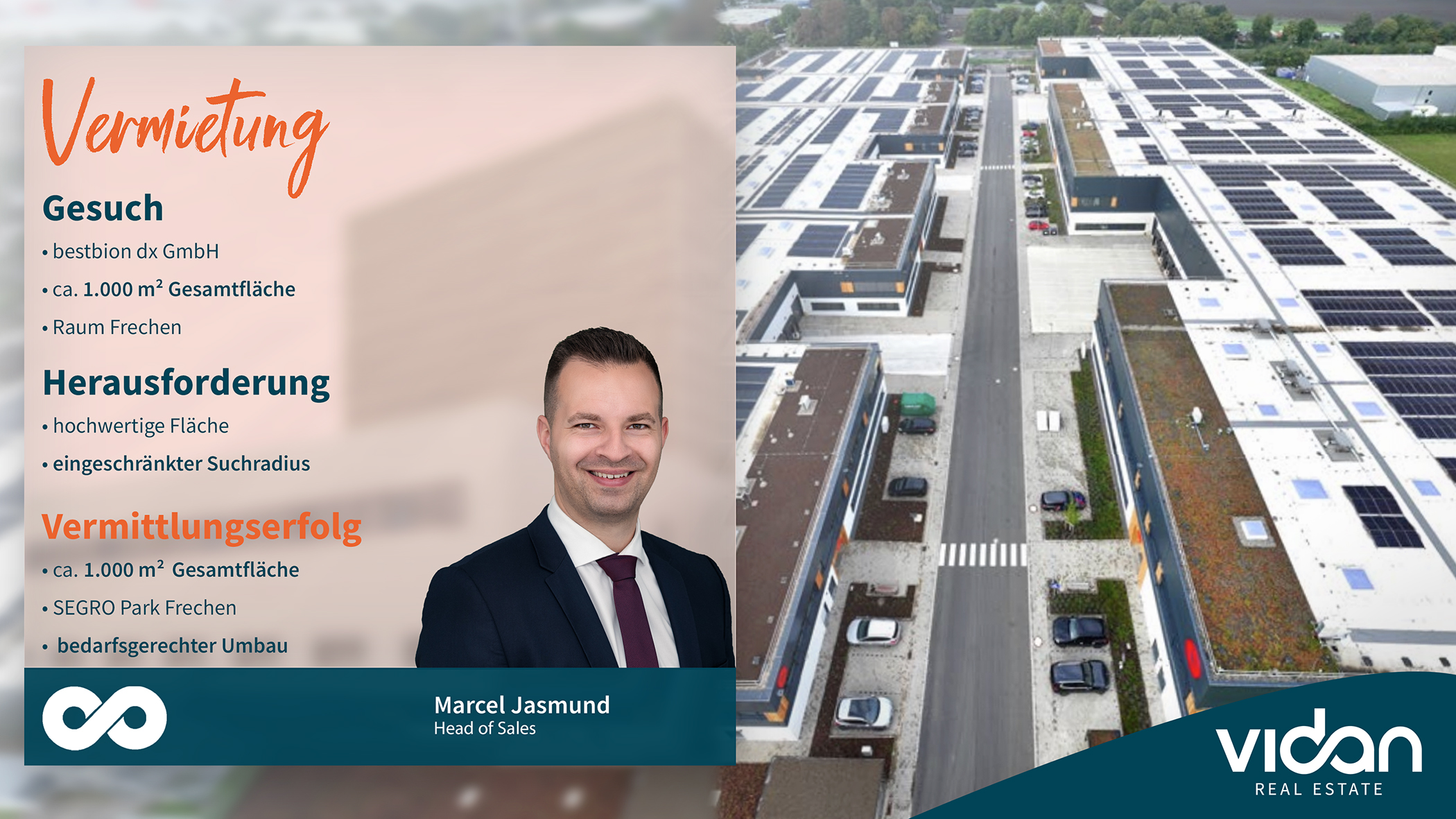 Vidan Real Estate GmbH vermittelt ca. 1.000 m² Gesamtfläche im SEGRO Park Frechen.